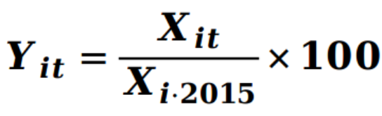 第一步:使用以2015年基期数值为100的方法,对三级指标进行标准化处理,得到个体指数。具体处理方法如下:
