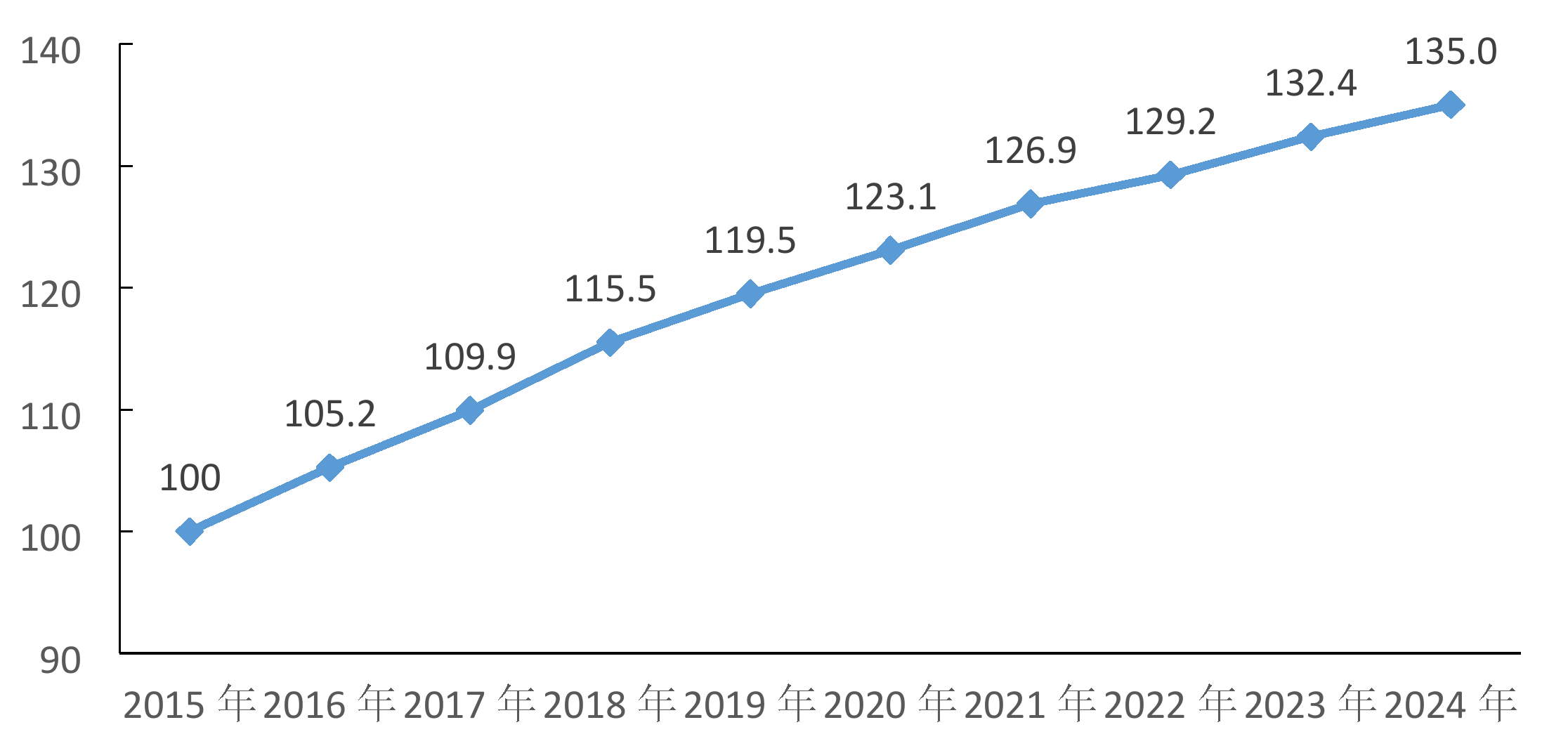 长三角区域民生共享指数稳步增长,2024年为130.4,比2023年提高0.9,与2018年相比年均上升3.1。2024年,长三角区域持续深化公共服务便利共享,群众获得感进一步提升。民生福祉持续增进,区域居民人均可支配收入达57137元,同比名义增长5.2%;人均公共财政支出达1.96万元,是2018年的1.3倍。医疗服务水平不断提升,2024年末,区域内医疗卫生机构床位数165.25万张,较2018年末增加36.18万张,每千人口医疗卫生机构床位数接近7张;异地就医结算覆盖范围不断扩大,实现了普通门诊、住院费用、门诊慢特病和药店购药异地直接结算,区域内41个城市、2.5万家医疗机构实现异地就医直接结算。公共服务更加便利共享,以“高效办成一件事”为牵引,跨地区、跨部门服务更加协同便利,截至2024年底,三省一市40类电子证照实现共享互认,累计开展政务服务事项或服务场景应用179项,实现长三角“一网通办、异地可办、就近办理”。