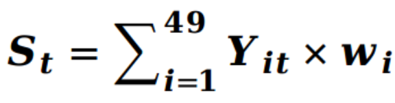 其中,Yit为第i个三级指标第t年个体指数,wi为第i个三级指标权重,St为第t年总指数。